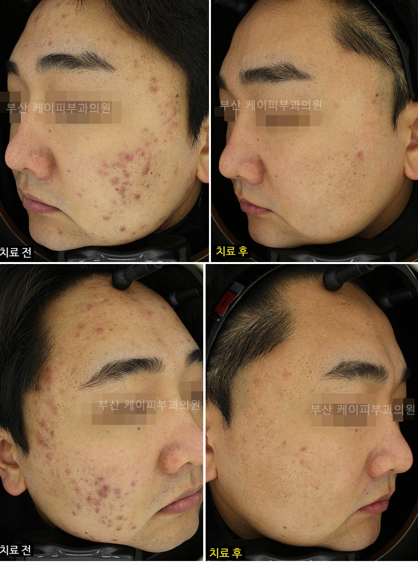 -염증성 병변이 대부분 사라지고 패인흉터, 피부결이 호전됨