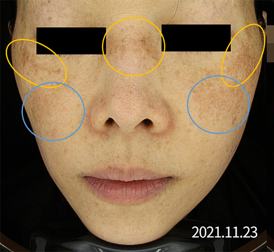내원 당시 전형적인 centrofacial melasma (양쪽 눈가, 콧등, 노란색 부분)를 관찰할 수 있으며,