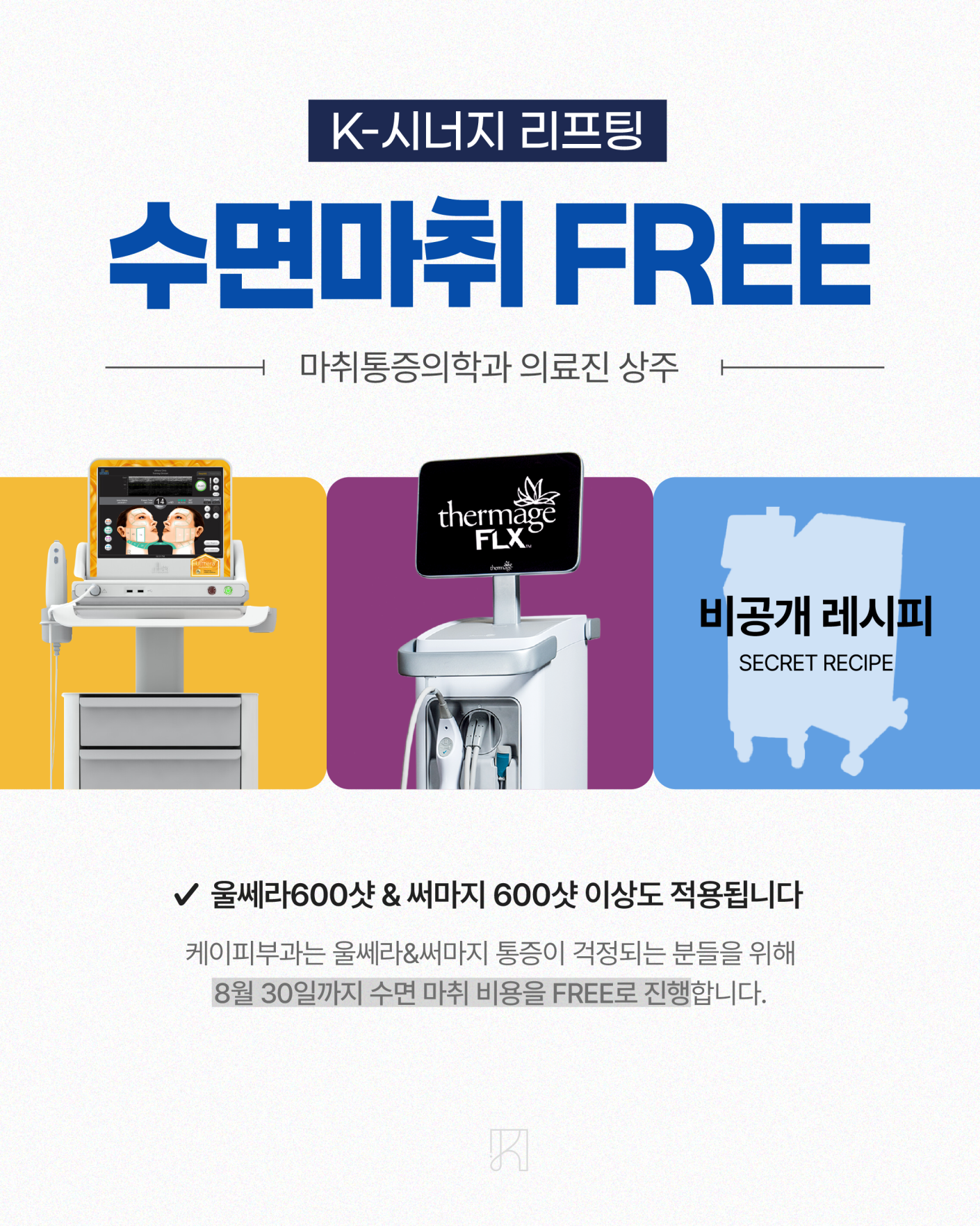 Notice 병원소식 K-시너지 리프팅 수면마취 FREE 케이피부과의원 | 2025-08-11 | 920 이전글스킨부스터 비수면 호흡마취 FREE 25.08.11 다음글앙코르 Re:set 흉터 치유 프로그램 25.08.06