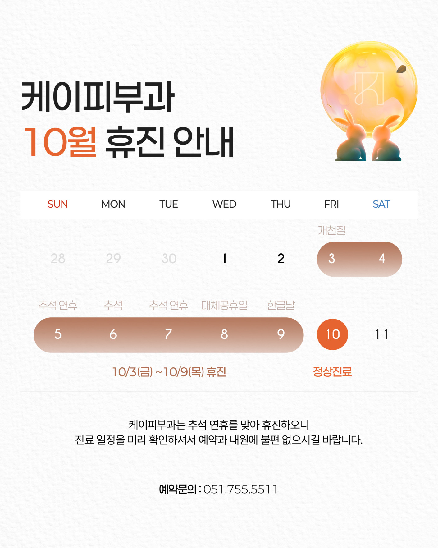 Notice 병원소식 10월 휴진안내 케이피부과의원 | 2025-09-17 | 629 이전글엘라비에 리투오 본사 물량 품절! 25.09.19 다음글김혜영 원장 단독 스페셜 이벤트 25.09.15