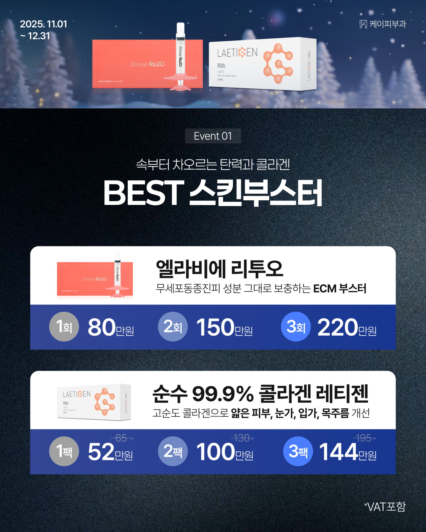 Notice 병원소식 BEST 스킨부스터 프로모션 리투오&레티젠 케이피부과의원 | 2025-10-31 | 387 이전글프리미엄 멀티레이어 리프팅 프로모션 25.10.31 다음글현태명 원장 단독 이벤트 25.10.21