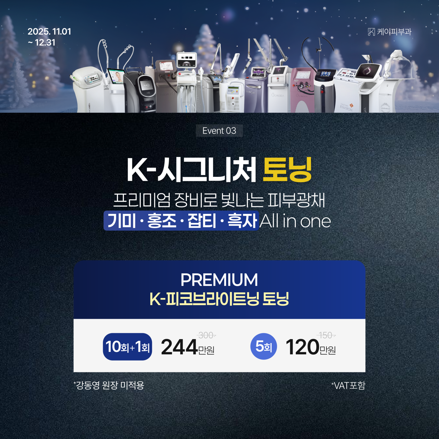 Event 케이피부과 이벤트 K-시그니처 토닝 2025-11-01 ~ 2025-12-31 이벤트 신청하기 이벤트 신청하기 이전글프리미엄 멀티레이어 리프팅 25.10.31 다음글앙코르 Re:SET 흉터 치유 프로그램 25.10.31