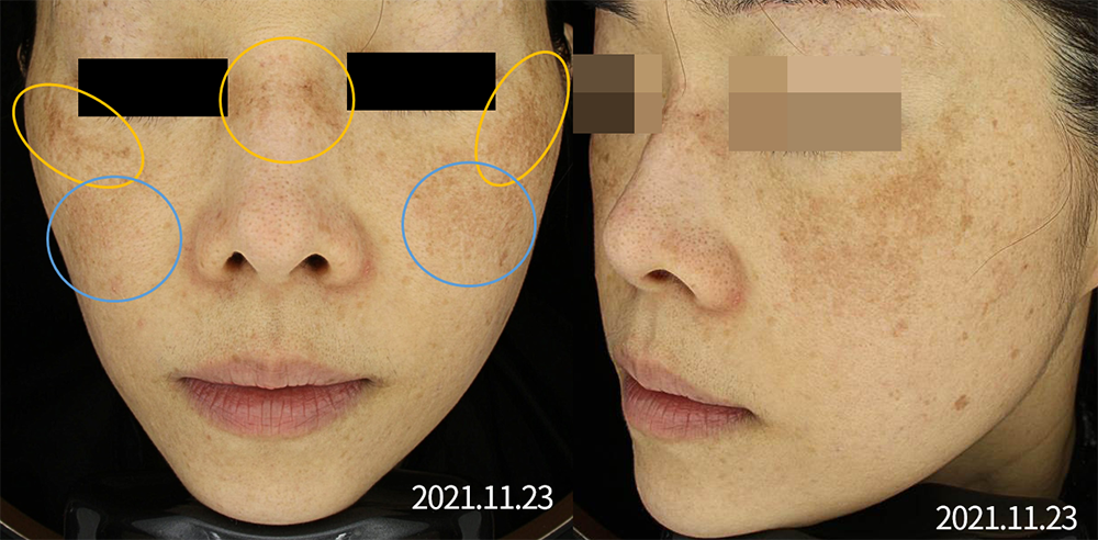 내원 당시 전형적인 centrofacial melasma (양쪽 눈가, 콧등, 노란색 부분)를 관찰할 수 있으며,