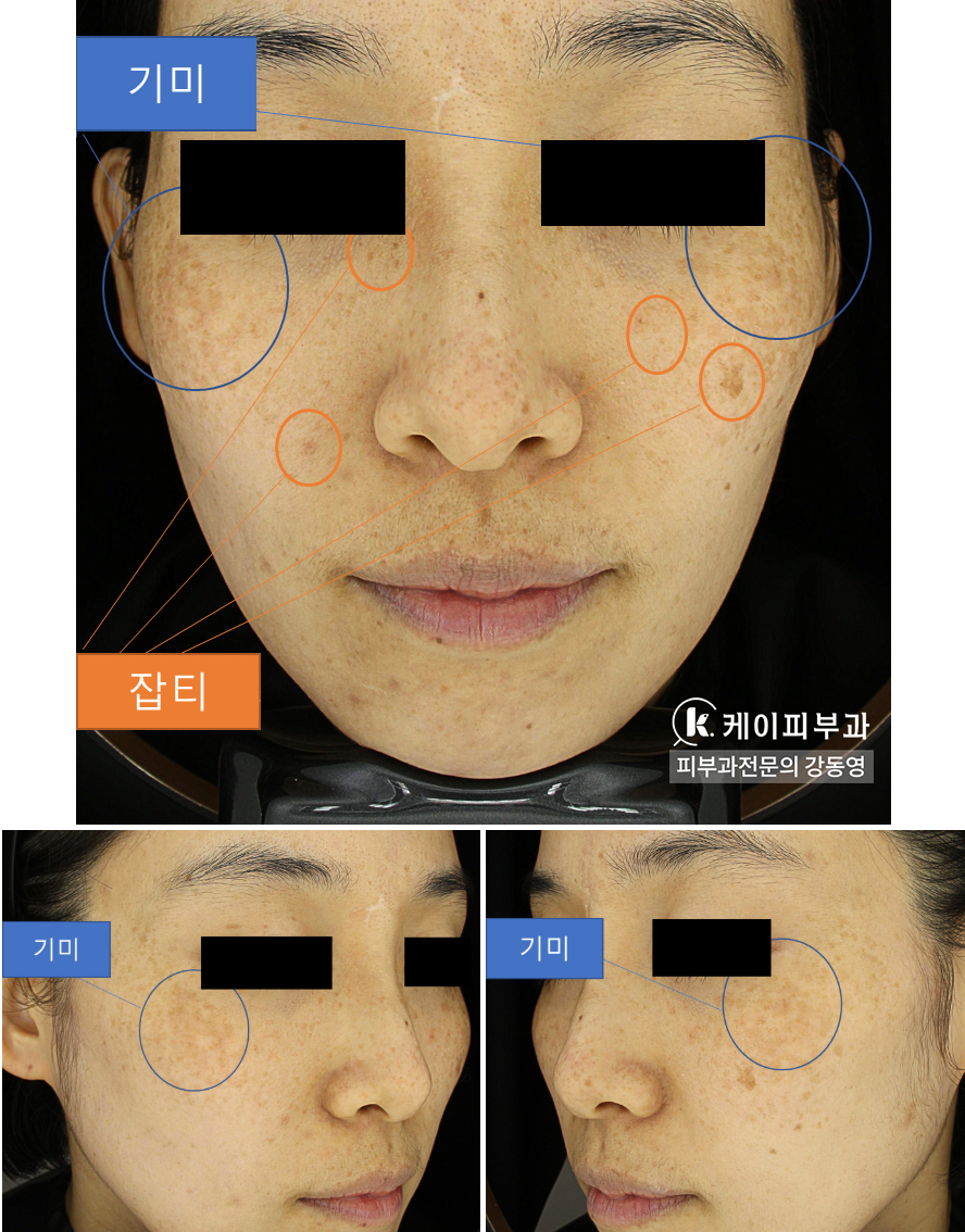 - 눈가 및 광대, 양 볼에 심한 기미잡티