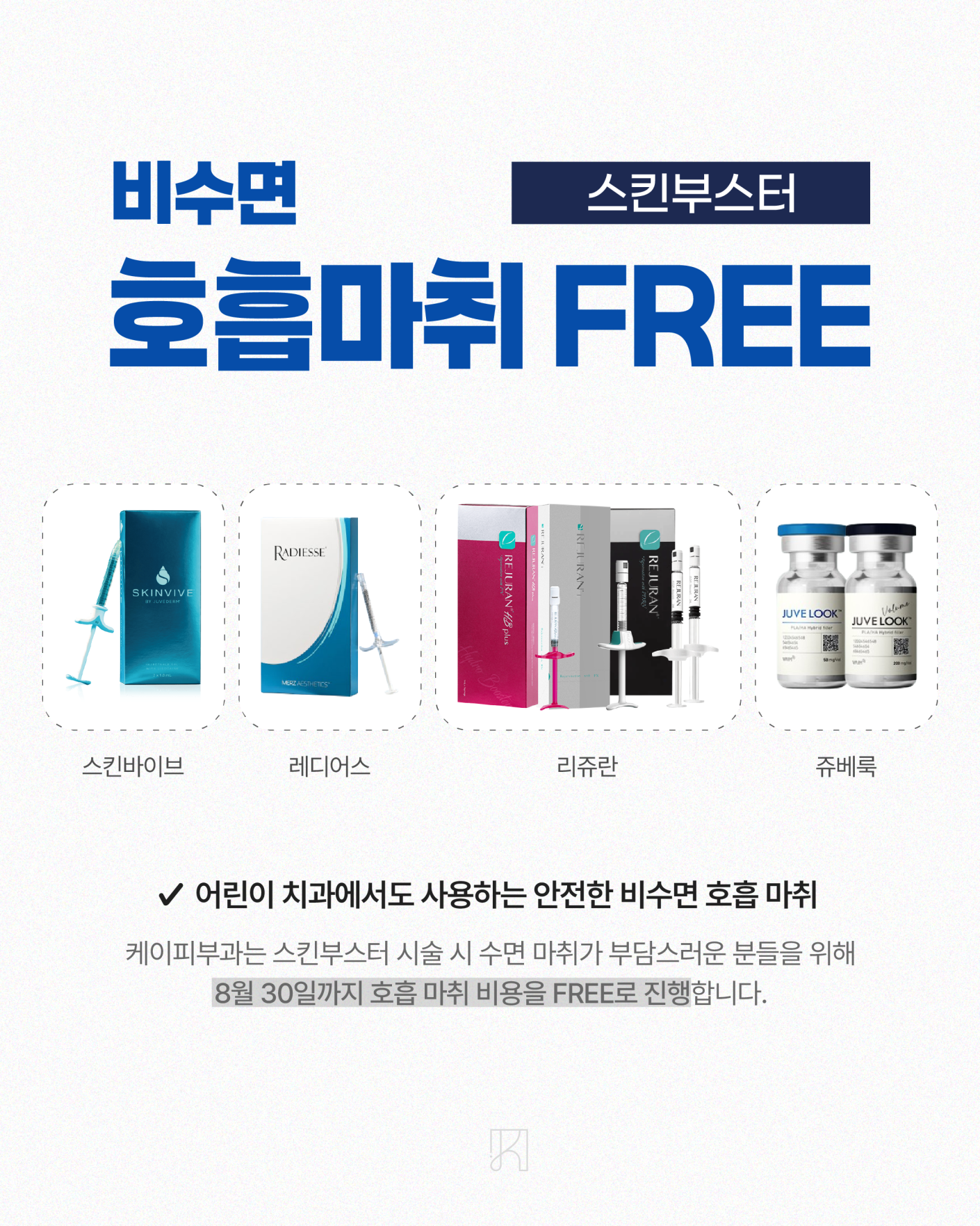 Notice 병원소식 스킨부스터 비수면 호흡마취 FREE 케이피부과의원 | 2025-08-11 | 966 이전글여름 스페셜 케어 25.08.14 다음글K-시너지 리프팅 수면마취 FREE 25.08.11